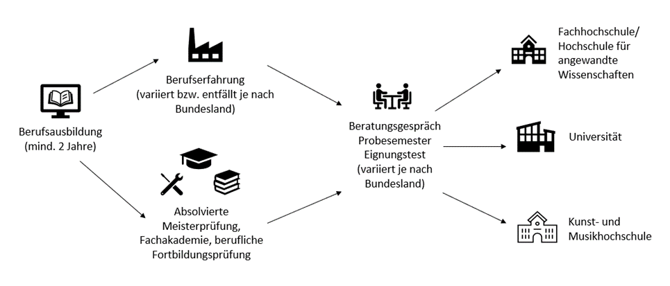 Personen, die ohne allgemeine Hochschul- und Fachhochschulreife studieren wollen, müssen einiges an Willensstärke und Durchhaltevermögen aufbringen, um sich durch das verworrene Netz der Besonderheiten zu kämpfen. Wie offen der Hochschulzugang für beruflich Qualifizierte in den einzelnen Bundesländern tatsächlich ist, regeln die jeweiligen Hochschulgesetze, welche in den meisten Fällen durch individuelle Verordnungen ergänzt werden. Die Basis für ein Studium ohne Abitur bildet, wie in der Grafik ersichtlich, eine mindestens zweijährige Berufsausbildung. Je nachdem, wie sich der berufliche Weg danach entwickelt hat, ergeben sich verschiedene Zugangswege.