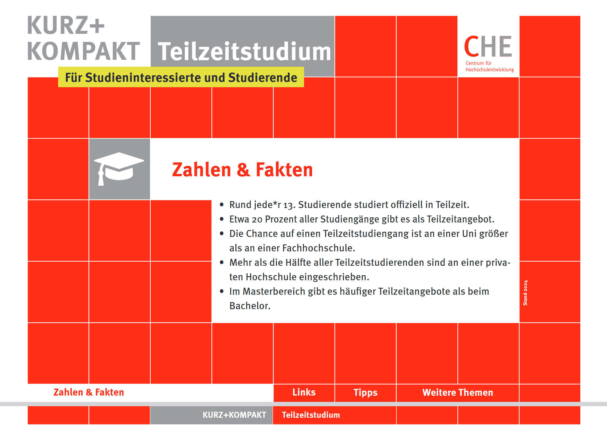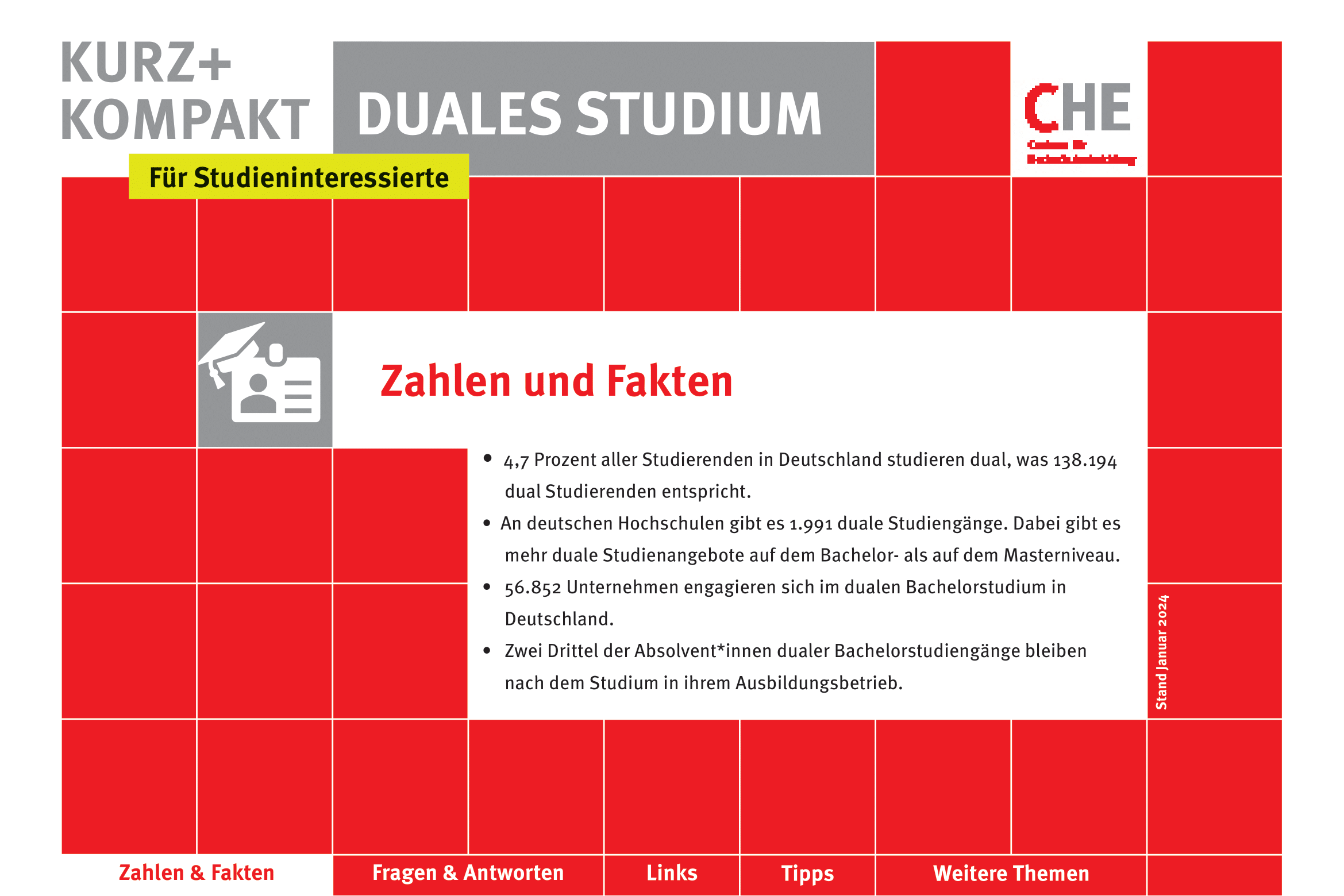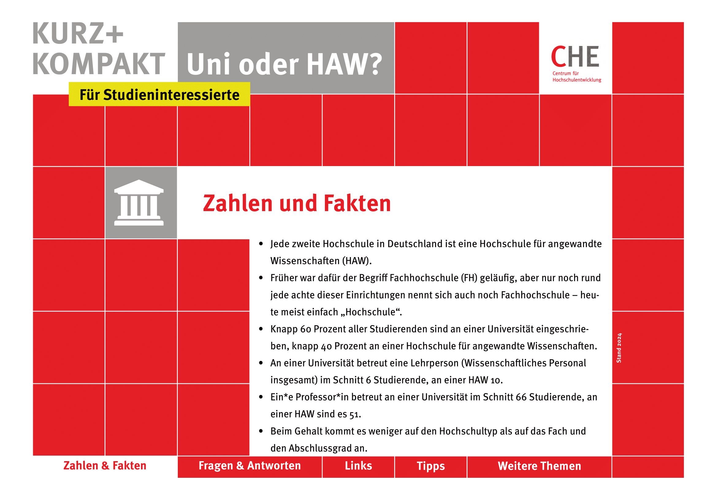 Die Reihe CHE kurz + kompakt bietet kompakte Informationen zu ausgewählten Themen. Auf wenigen Seiten finden sich Antworten auf die wichtigsten Fragen zum jeweiligen Thema und eine kommentierte Linkliste. Checklisten für nächste Schritte und weitere Recherchen runden das Infopaket im PDF-Format ab. Sämtliche Publikationen stehen kostenfrei als Download zur Verfügung.