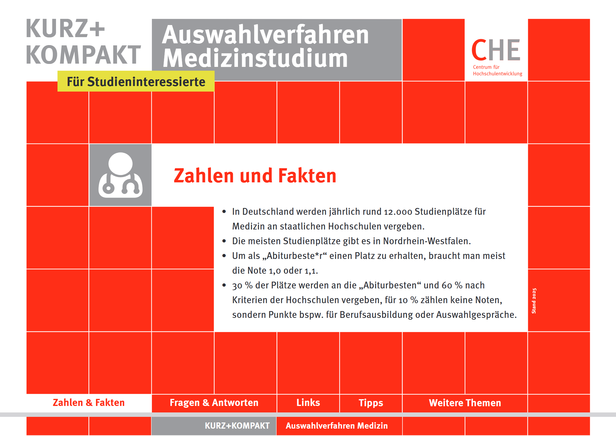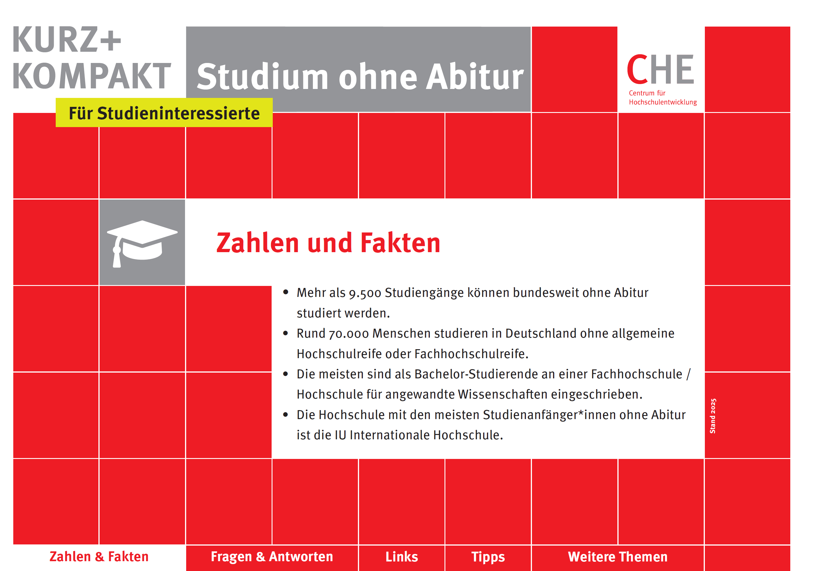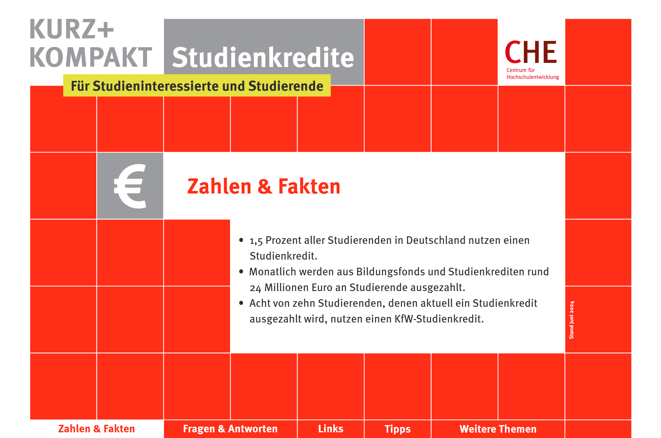 Die Reihe CHE kurz + kompakt bietet kompakte Informationen zu ausgewählten Themen. Auf wenigen Seiten finden sich Antworten auf die wichtigsten Fragen zum jeweiligen Thema und eine kommentierte Linkliste. Checklisten für nächste Schritte und weitere Recherchen runden das Infopaket im PDF-Format ab. Sämtliche Publikationen stehen kostenfrei als Download zur Verfügung.